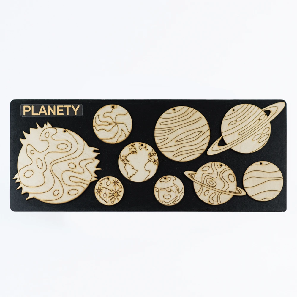 Rozměry: planety průměr od 5–15 cm, deska 18 × 45 cm.
